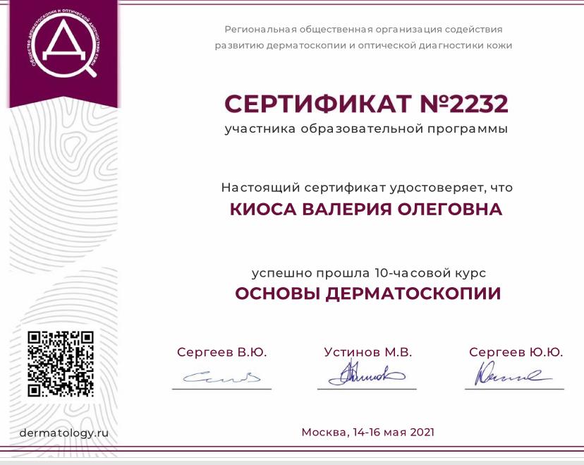 2018 г. – "Косметология", Московский областной научно-исследовательский клинический институт имени М.Ф.Владимирского; "Трихология. Диагностика и лечение заболеваний волос. Избранные методы восточной медицины", Российский университет дружбы народов.